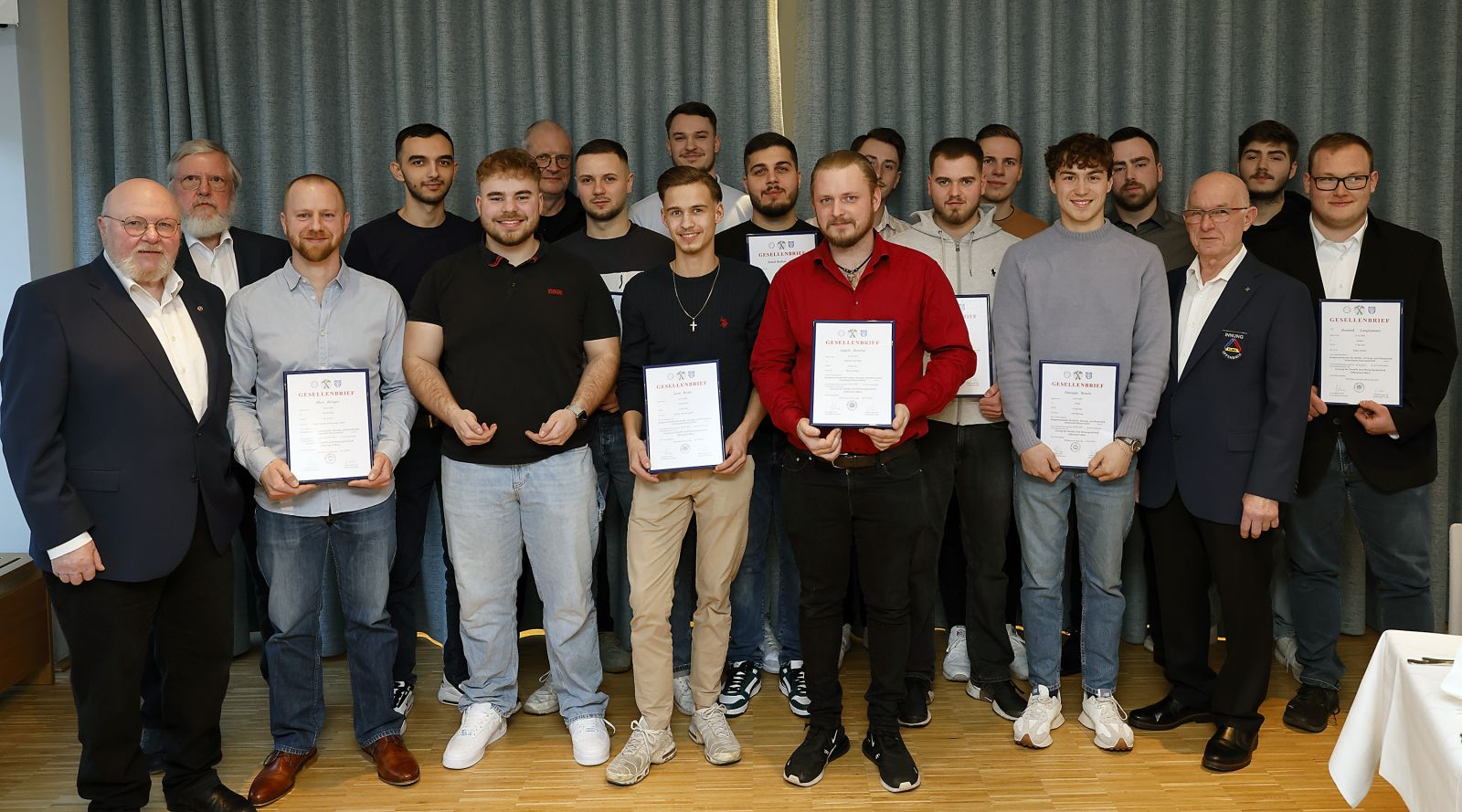 Obermeister Willibald Berg (ganz links) hat am 23.02.24 16 neue Gesellen freigesprochen.